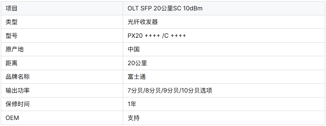 OLT SFP 20KM SC 光收发器模块支持 2.5G 的速率,并提供从 7dB 到 10dB 的输出功率选项,适用于 GPON 和 EPON 应用。凭借 1 年保修和 OEM 支持,确保了 FTTH 光纤设置的可靠性能
