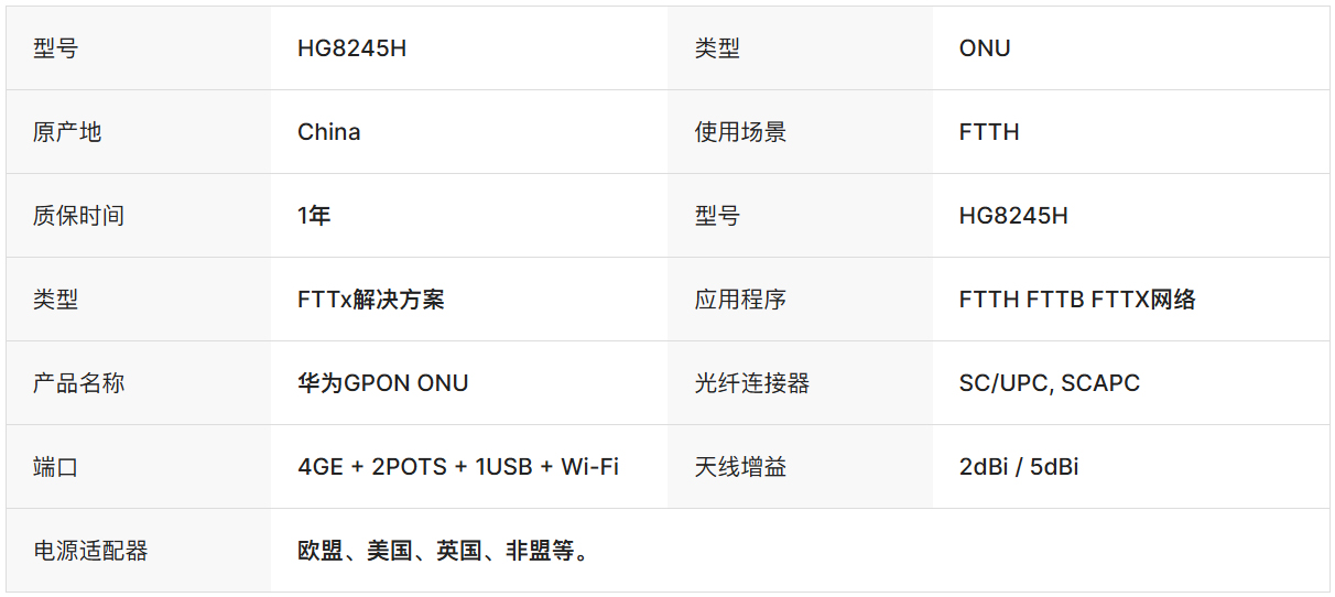 华为HG8245H GPON ONU支持FTTH网络,配备4GE、2POTS和Wi-Fi端口,具有B+/PX20+级PON接口以及Tx 1310nm、Rx 1490nm波长。它包含自适应以太网端口、外置天线支持以及广泛的电源适配器兼容性,适用于全球使用。