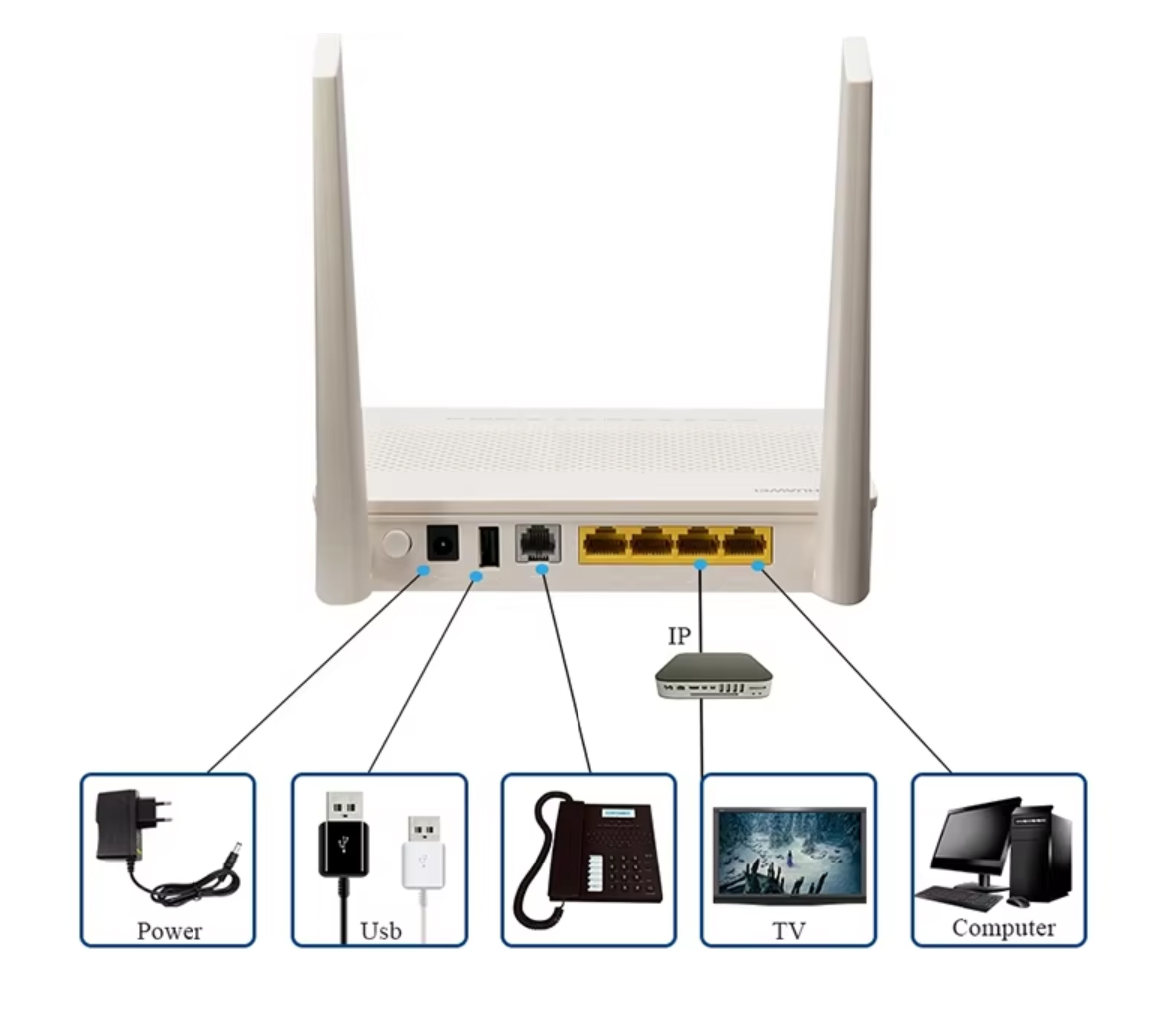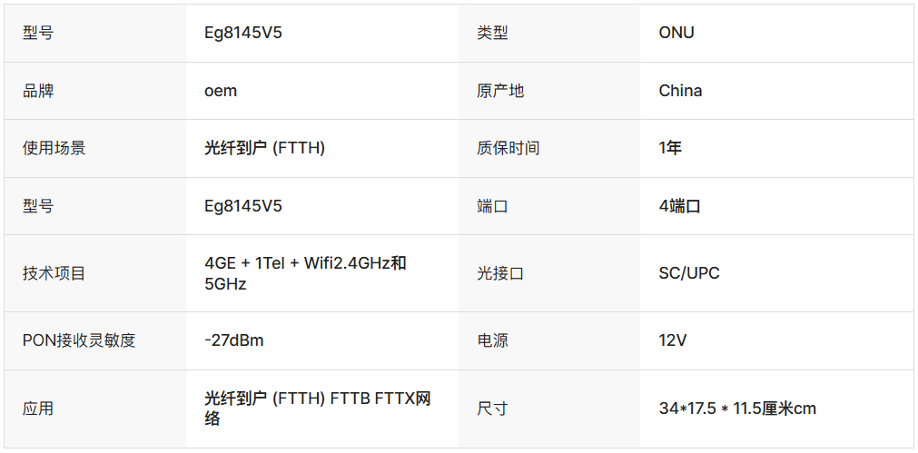 华为EG8145V5是一款双频ONT,支持2.4G和5G WiFi、具备4个GE端口,为语音、数据和高清视频服务提供卓越的转发性能。它支持GPON技术,下行速率高达950Mbps,上行速率高达930Mbps,并配有2根5dBi增益的外置天线以增强连接性。