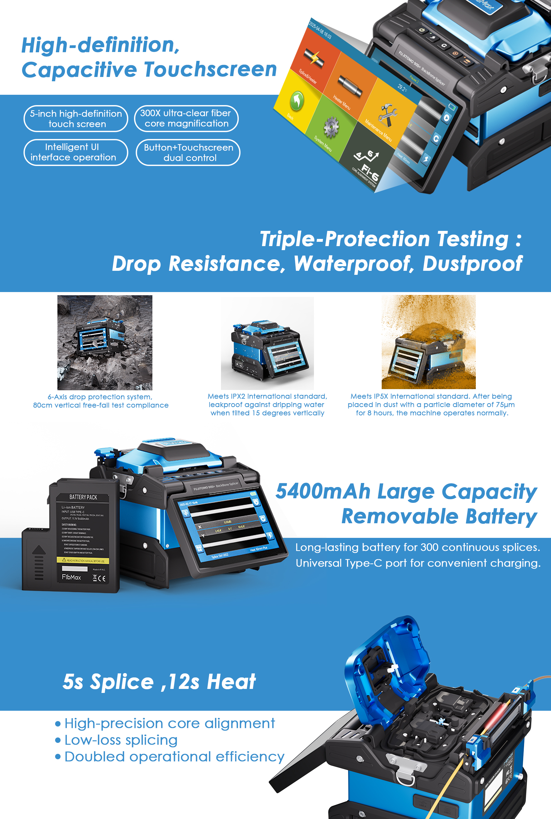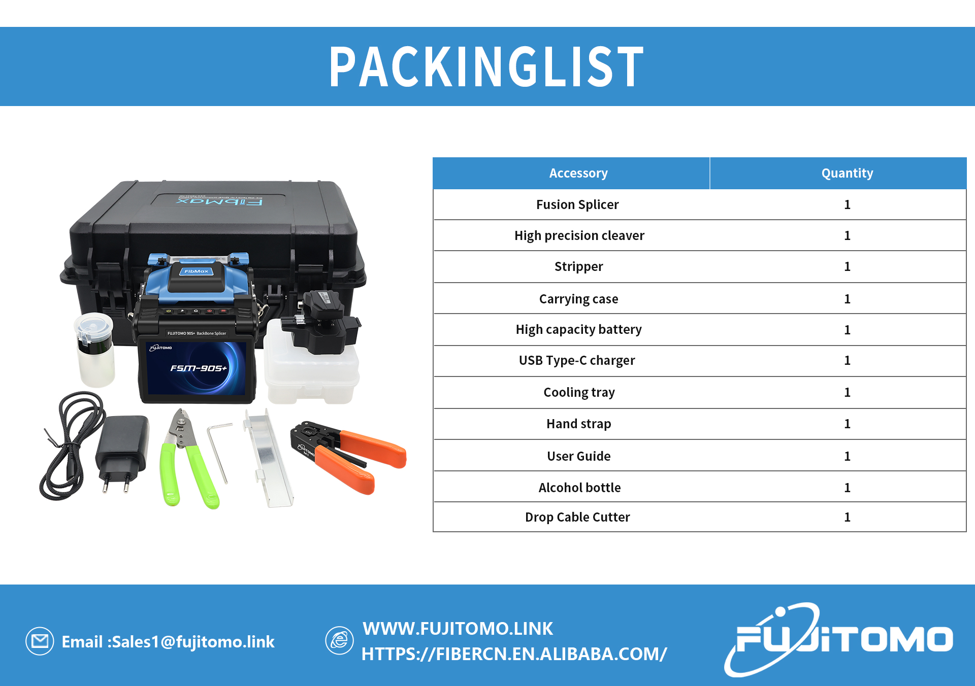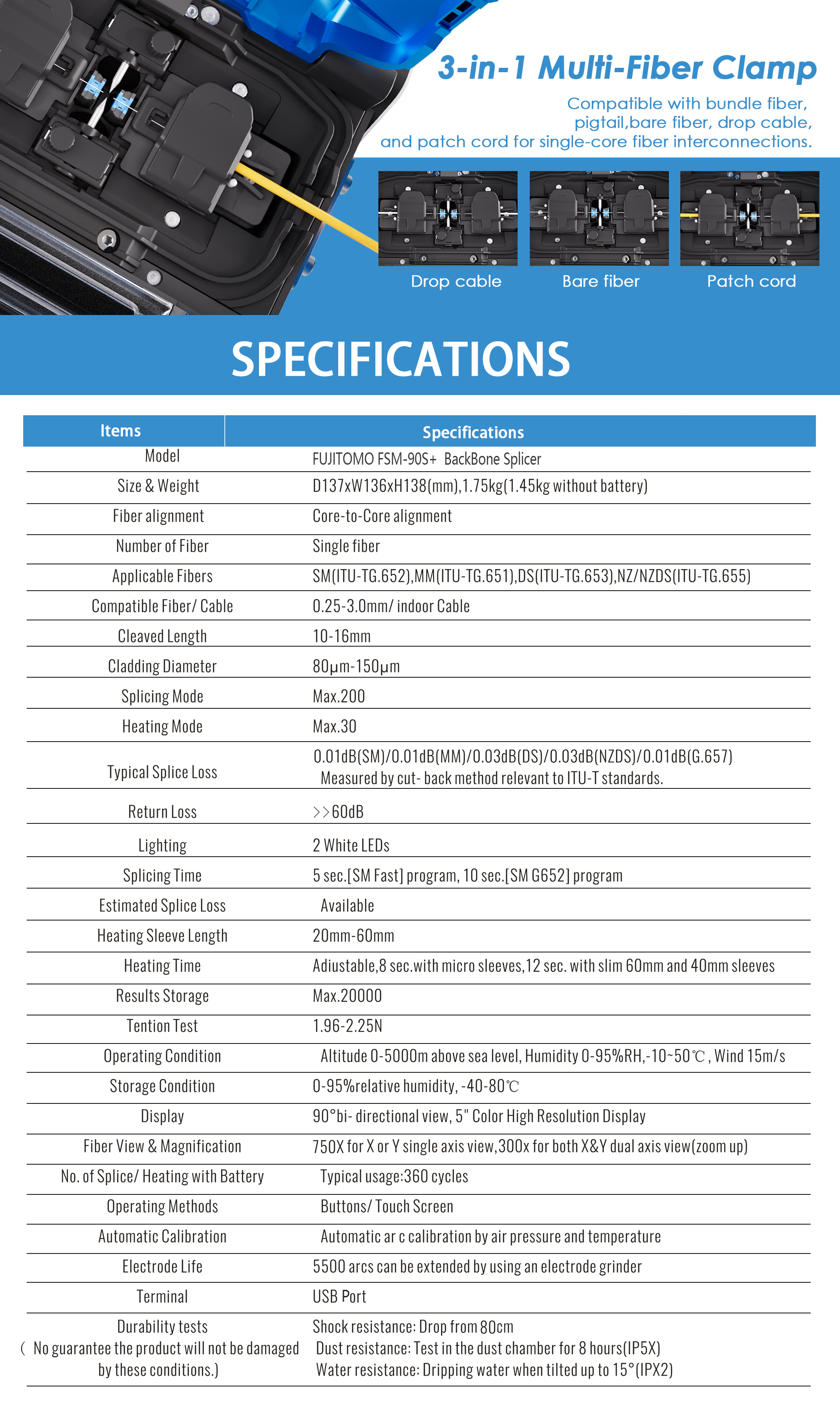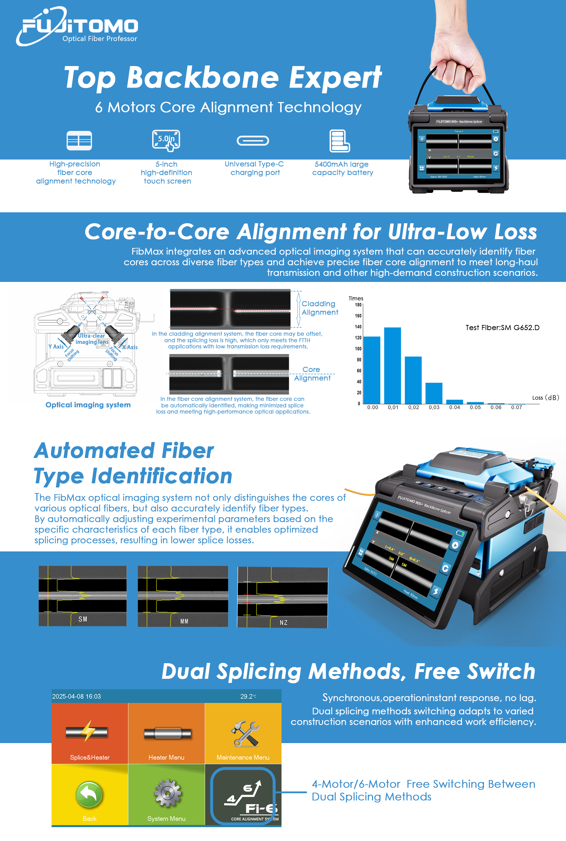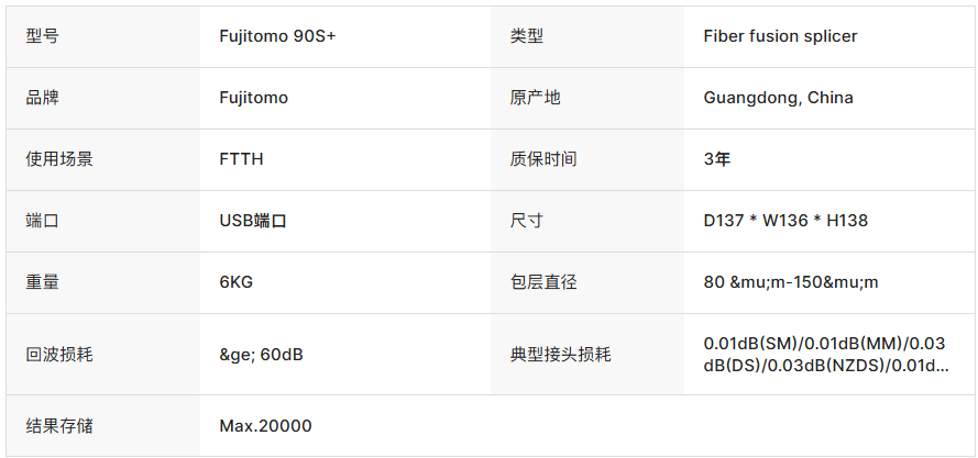 Fujitomo 90S+ 光纤熔接机配备 6 个电机,支持 G654E 光纤,提供 ≥60dB 的回波损耗和低至 0.01dB 的典型熔接损耗(适用于 SM 和 G.657 光纤)。它确保包层直径在 80μm 至 150μm 范围内的精准度,并能可靠存储多达 20,000 条结果记录。